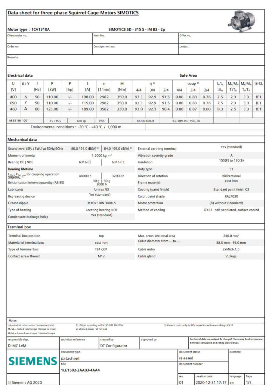 • 3AA03: مشخصات توان ۱۱۰ کیلووات، سرعت ۳۰۰۰ دور، سایز فریم ۳۱۵S و ولتاژ ۴۰۰/۶۹۰ ولت