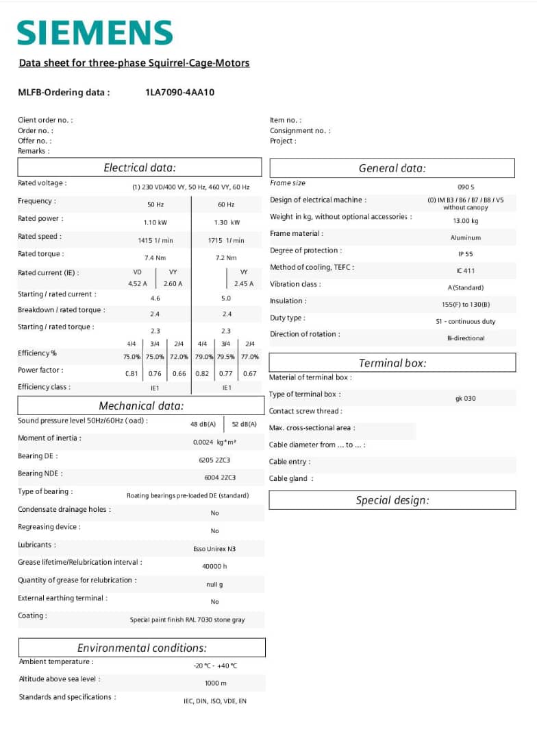 مشخصات فنی الکتروموتور زیمنس 1LA7090-4AA10