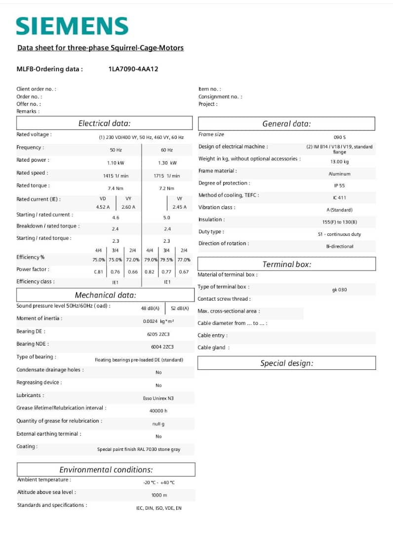 الکتروموتور 1LA7090‑4AA12 نوعی موتور القایی با روتور قفس سنجابی است که برای استفاده در تجهیزات صنعتی با بارهای سبک تا متوسط مناسب است. این مدل دارای مشخصات فنی زیر است: