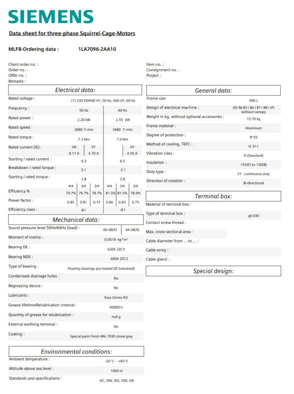آشنایی با مشخصات فنی موتور، نقش مهمی در انتخاب صحیح آن دارد. مهمترین مشخصات الکتروموتور زیمنس 1LA7096-4AA10 عبارتاند از: