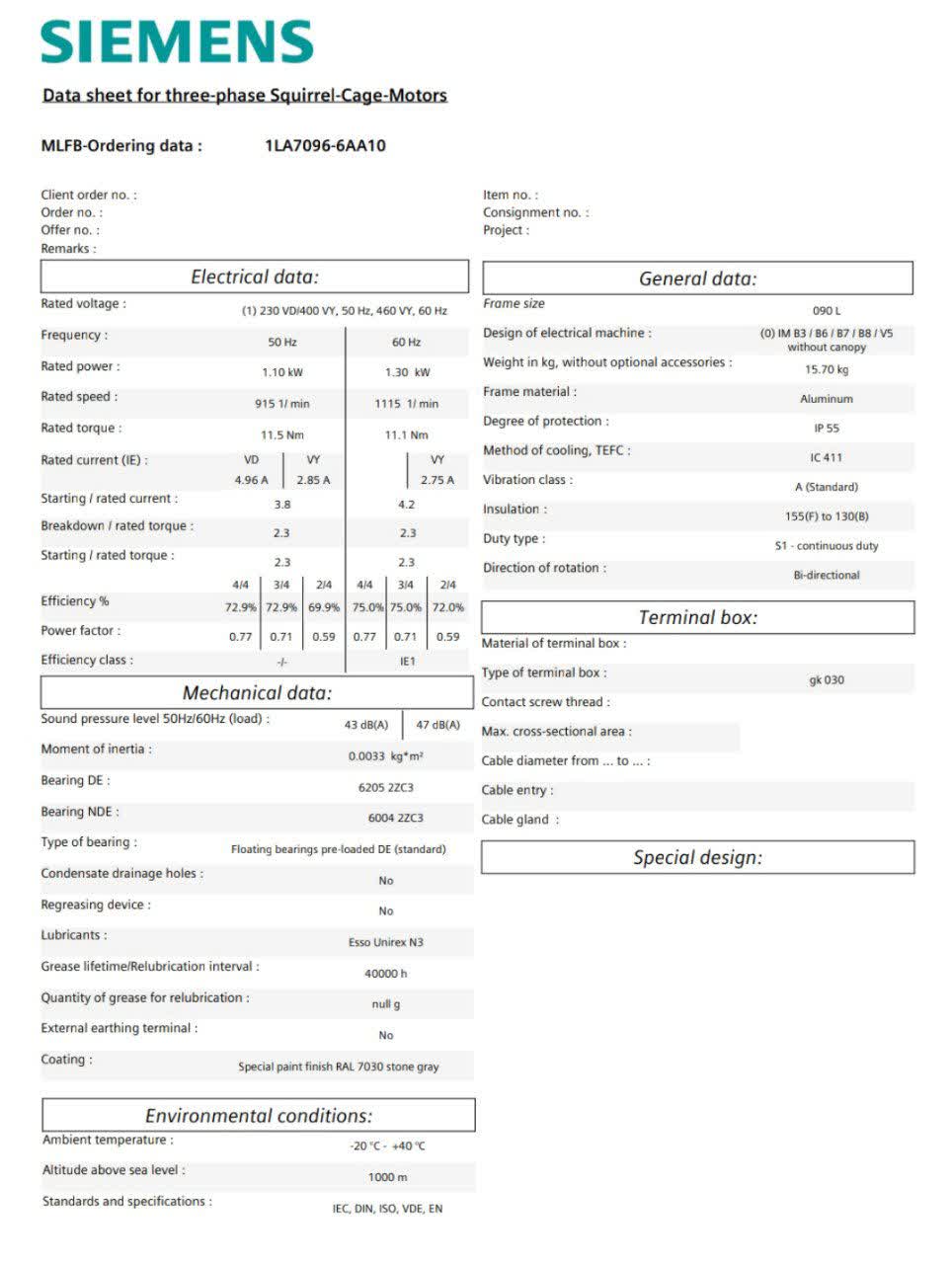 موتور 1LA7096‑6AA10 دارای مشخصات فنی طراحیشده برای محیطهای صنعتی است که اطمینان از عملکرد پایدار و طول عمر بالا را فراهم میکند: