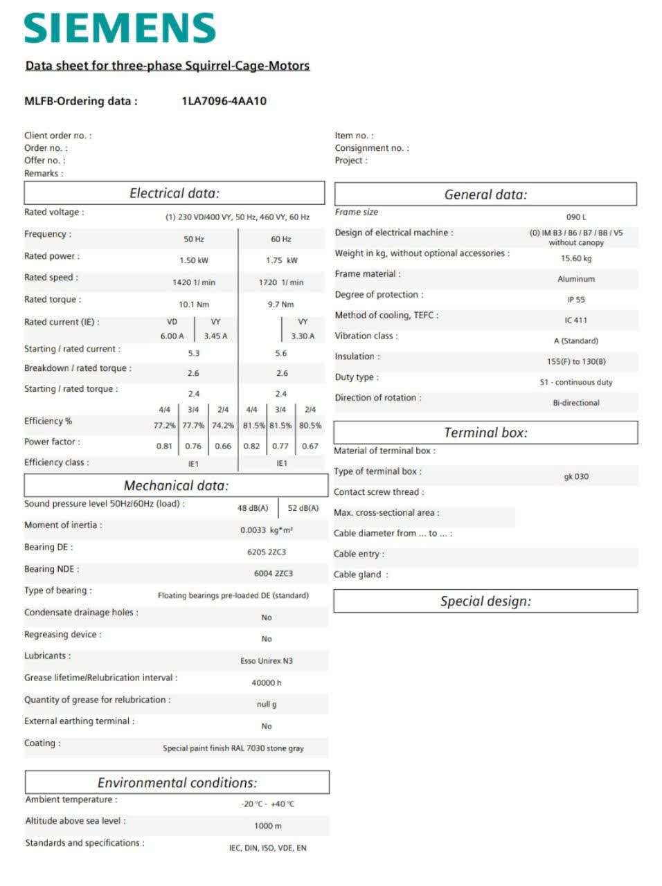 الکتروموتور 1LA7096‑6AA11 دارای ویژگی‌های فنی استاندارد زیر است که آن را برای استفاده در محیط‌های صنعتی مناسب می‌کند: