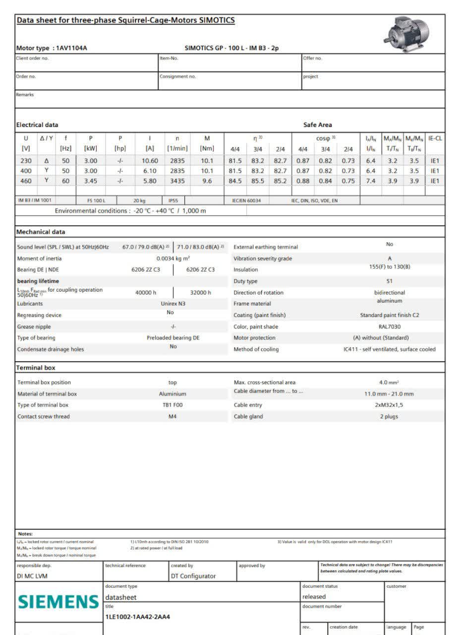 در حالی که مشخصات فنی دقیق برای هر کانفیگ ممکن است متفاوت باشد، موتور 1LE1002‑1AA42‑2AA4 به‌طور کلی دارای ویژگی‌های مهم زیر است: