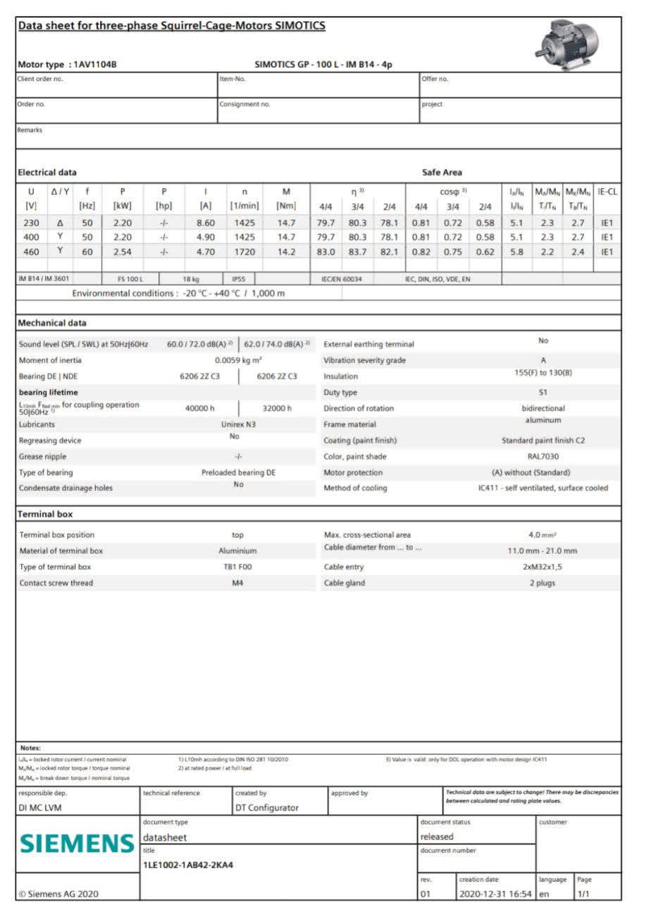 مشخصات فنی الکتروموتور Siemens 1LE1002-1AB42-2KA4