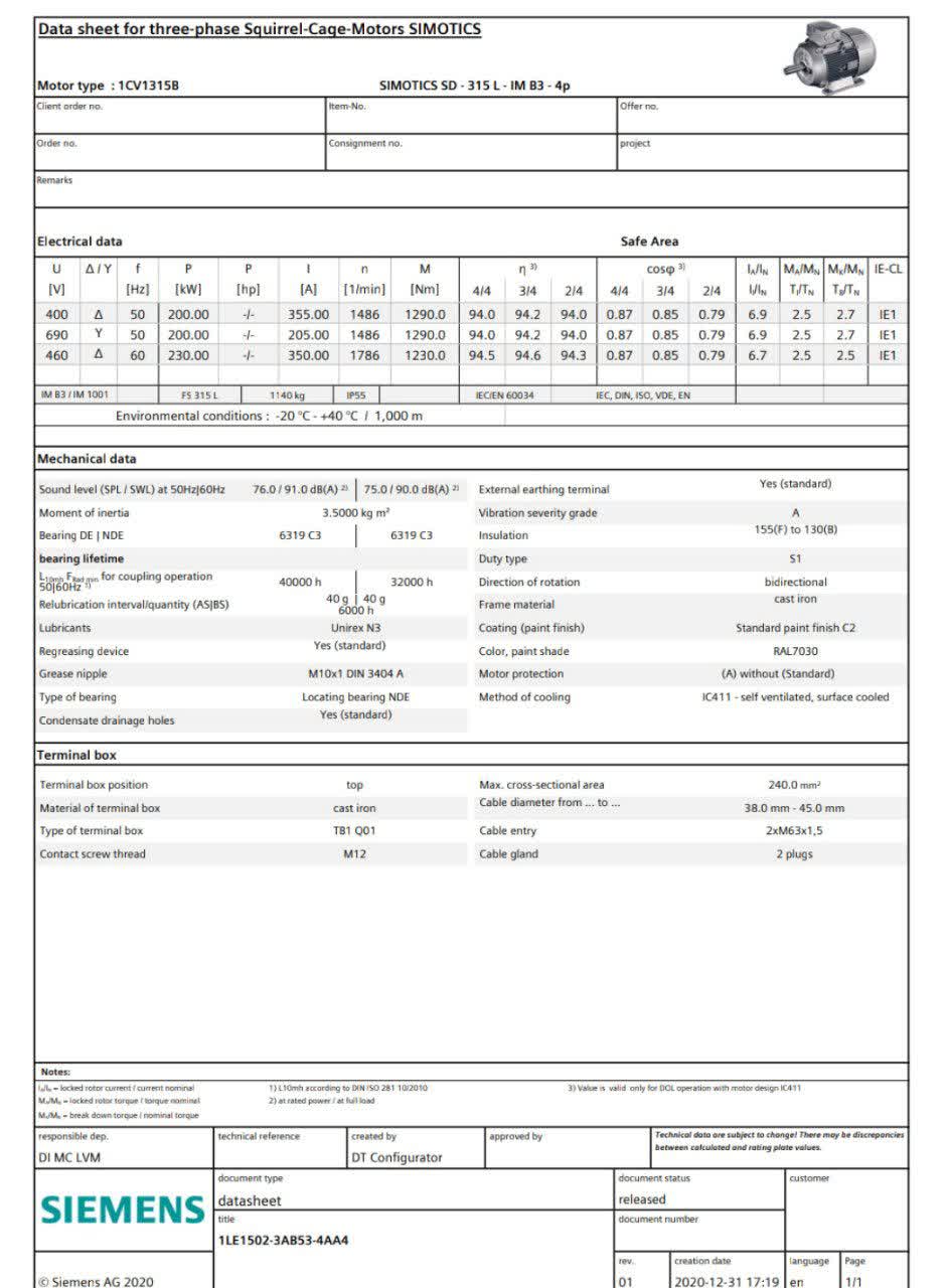 مشخصات فنی الکتروموتور Siemens 1LE1502‑3AB53‑4AA4